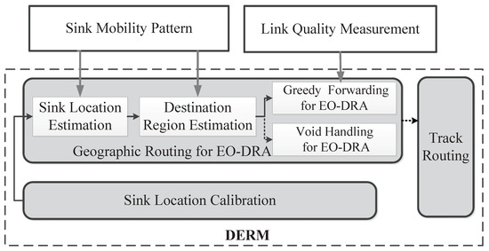 To address this problem, the design of DERM mainly includes three components, as shown in Figure 2. Firstly, a geographic routing protocol tailored for EO-DRA is proposed. Each node estimates the current sink location and destination region by the sink mobility pattern. Then, it delivers the newly generating packet to any node in that region in a greedy manner based on a comprehensive metric considering both the location information and the link quality. To handle the communications void, we adapt the traditional perimeter routing for EO-DRA and demonstrate the efficacy. Secondly, we observe that the estimated location may not be accurate due to some factors such as pauses and velocity fluctuations. Therefore, an efficient sink location calibration method is adopted, with which each node updates the sink location when its route length dilation exceeds a certain limit caused by the outdated information. The method has low control overhead, and can still ensure high routing energy efficiency. Thirdly, for each node, there still exist unexpected sink location errors incurred by delayed updating or unpredicted movement deviations in future. Thus, we further propose a fault-tolerant mechanism named track routing. If a packet has been transferred to and buffered in an RN, but finds that the sink has not arrived by the deadline, it will exploit a reliable forwarding approach to track the sink along the path P and complete the last-mile delivery.