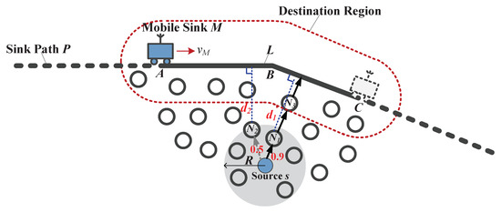 Object function (2) minimizes the energy cost taking for transferring a packet from the source node s to the destination node . The cost is defined as the total number of transmissions and can be estimated by the accumulated ETX (Expected Transmission Count) of all links (termed e) along the path from s to (termed ). Equation (3) indicates that is located in the destination region, which means must be an RN, and the time for the sink M to reach it is less than . We can see that the destination region varies as the sink moves.