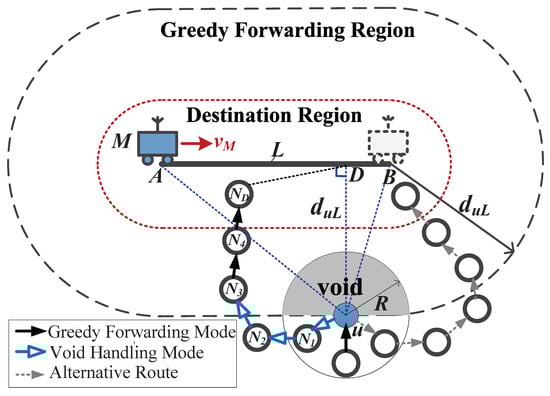 As shown in Figure 4, a packet gets stuck at void node u. The shortest distance from u to the travel path L is . u cannot find a one-hop neighbor in the greedy forwarding region where the nodes’ distances to L are less than . Then, the stuck packet enters the void handling mode. Its virtual destination is D and the sink location is A. Points u, A, and D are sequentially visited in the clockwise direction. To find a path towards L clockwise, the packet traverses the faces crossed by the line using the counterclockwise direction of the right-hand rule. It will return to the greedy forwarding mode at node .