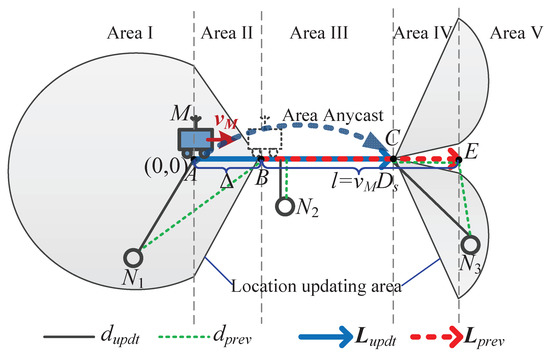 Figure 5 shows an example of the sink location calibration in DERM. The sink is currently located at A deviated from the estimated location B for meters. The travel path length within the delay constraint is l. The sink broadcasts its current location information. Each node receiving the updated information will calculate its and based on Equations (12) and (13). Figure 5 depicts and of three nodes, i.e., in Area I, in Area III, and in Area V. Take node as an example. Its is and is . If , the node will update the sink location and forward it. Without loss of generality, the coordinate of A is set as (0, 0). A node whose coordinate is will be required to forward the updated location if satisfying the following conditions: