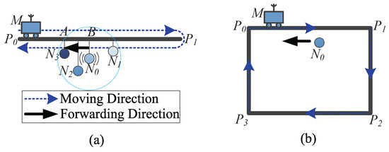 We consider a WSN with a mobile sink M and N static sensor nodes deployed in a monitoring area, as shown in Figure 1. Each node has the same transmission radius R. The sink periodically travels along a fixed path with a constant speed , and knows its own mobility pattern, which is uncontrollable.