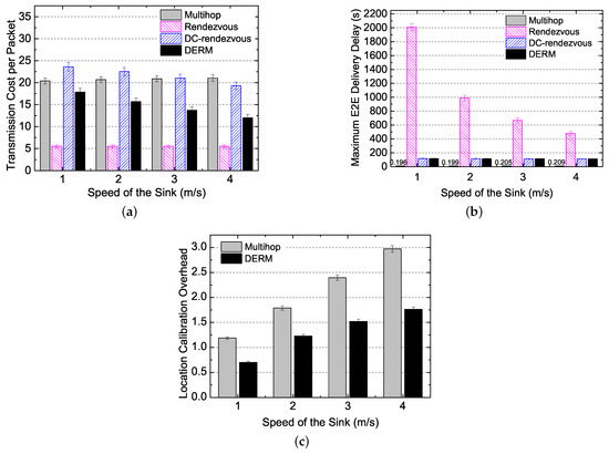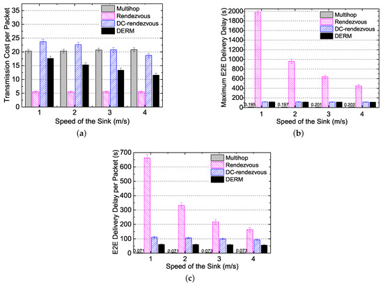 Performance overview under different sink speeds in ideal movement scenarios ( = 120 s). (a) transmission cost per packet; (b) maximum end-to-end delivery delay; (c) end-to-end delivery delay per packet.