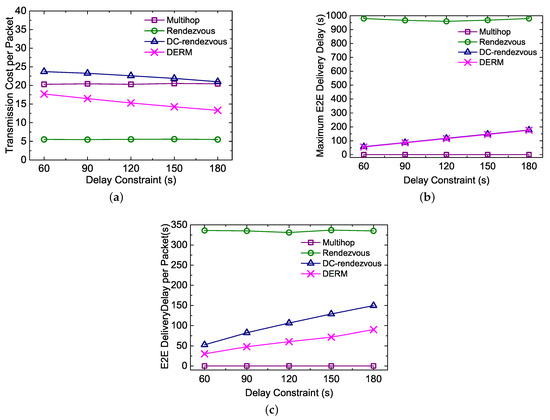 In Figure 9, we study the impact of the delay constraint on the performance of different routing schemes. Figure 9a shows that the transmission cost per packet of DERM and DC-Rendezvous decreases by and , respectively, when the delay constraint is increased from 60 to 180 s. This is because, like increasing the speed, relaxing the delay constraint will also enlarge the destination region. Figure 9b illustrates that DERM as well as DC-Rendezvous can always meet the corresponding delay requirement when the constraint is changed. Not surprisingly, the performance of Multihop and Rendezvous is little affected by the delay constraint, as shown in Figure 9a–c.