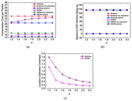 As depicted in Figure 11a, the transmission cost of DERM and Multihop increases with since a greater route length dilation is allowed. Figure 11b shows that has almost no influence over the maximum E2E delay because the track routing can always guarantee on-time packet delivery. On the other hand, the location calibration overhead is reduced when is varied from 1.2 to 2.4, as shown in Figure 11c. We see that adjusting can strike a balance between the routing efficiency and the overhead. It is noted that, when is set to 1.2, the two approaches achieve approximately optimal transmission cost. For DERM and Multihop, the number of transmissions per packet is reduced by about 1 and 2.3, respectively, compared with their corresponding upper bounds. Therefore, under this setting, the reductions are considerable while the control overhead is acceptable.