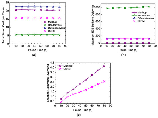 Impact of the pause time ( = 2 m/s, = 120 s, and = 1.2). (a) transmission cost per packet; (b) maximum end-to-end delivery delay; (c) location calibration overhead.