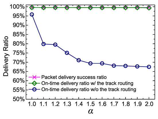 Delivery ratio of DERM with and without the track routing ( = 2 m/s, = 120 s, and the pause time is 30 s).