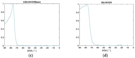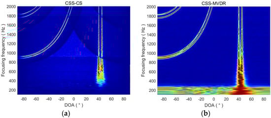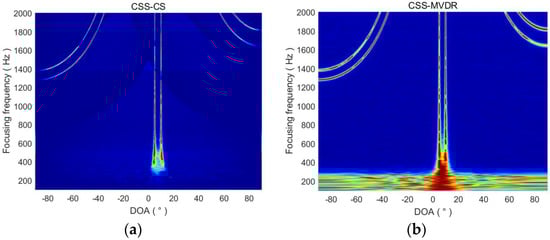 The spatial spectrum of each sub-band can be obtained by using the narrow band beamforming method for , and the total spatial spectrum can be obtained by summing the spatial spectrum of each sub-band. The target DOA can be obtained by searching for the peak value of the total spatial spectrum. In this way, the CSS-MVDR method uses the MVDR narrowband beamformer and CSS-CS method uses the CS narrowband beamformer after the focusing transformation.