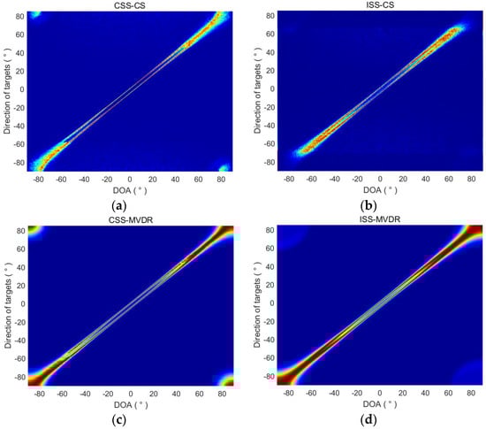 DOA estimation results of CSS-CS, ISS-CS, CSS-MVDR and ISS-MVDR in terms of target directions. (a) DOA estimation results of CSS-CS; (b) DOA estimation results of ISS-CS; (c) DOA estimation results of CSS-MVDR; (d) DOA estimation results of ISS-MVDR