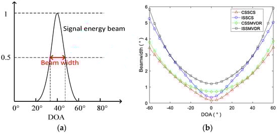 The definition of beam width is shown in Figure 5a. It shows that the beam width is the angle range measured between the half-maximums of the signal energy beam in the spatial spectrum, when the DOA is estimated. The beam width shows the resolution of two targets in different directions in space. The beam widths of the four methods for DOA estimation of wideband targets in the range of −60° to 60° are shown in Figure 5b. It shows that, when the target is in the range of −20° to 20°, the directional resolution of CSS-CS is higher than the other three methods, ISS-CS and CSS-MVDR are intermediate, and ISS-MVDR is the worst. When the target is in the range of −60° to −20° and 20° to 60°, the directional resolution of the algorithms under the CSS processing framework is higher than the algorithms under the ISS processing framework; moreover, the resolution of the CSS-CS is slightly higher than that of the CSS-MVDR, and the resolution of the ISS-CS is slightly higher than that of the ISS-MVDR.