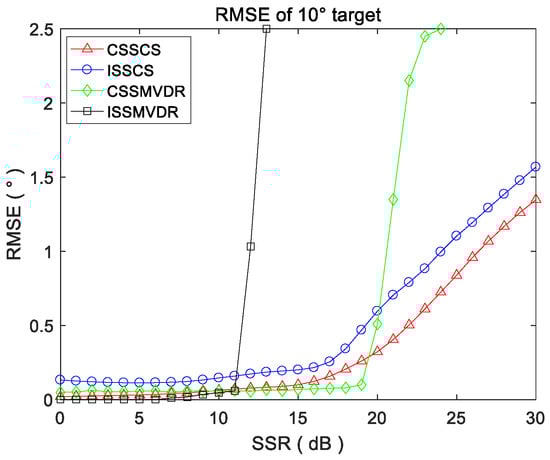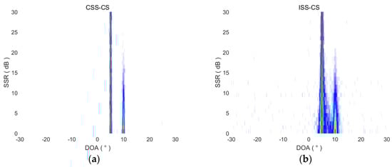 where  and  are the two signal powers, and the unit of SSR is dB. We let the 5° signal power remain unchanged and the 10° signal power gradually weaken. When the SSR of the 5° signal and the 10° signal changes from 0 dB to 30 dB, the DOA estimation of the four methods is as shown in Figure 6. It shows that, when the SSR is higher than 20 dB, CSS-CS can also complete the detection and DOA estimation for the weak 10° signal. The performance of CSS-CS is better than the other three methods, ISS-CS and CSS-MVDR are intermediate, and ISS-MVDR is the worst.