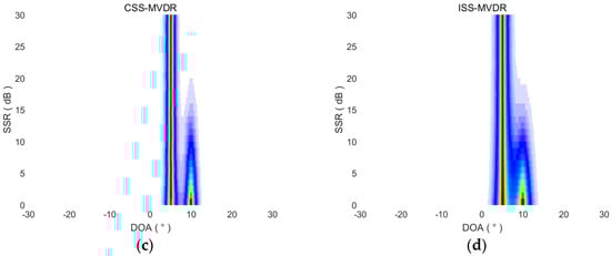 DOA estimation results of CSS-CS, ISS-CS, CSS-MVDR and ISS-MVDR in terms of SSRs. (a) DOA estimation results of CSS-CS in terms of SSRs; (b) DOA estimation results of ISS-CS in terms of SSRs; (c) DOA estimation results of CSS-MVDR in terms of SSRs; (d) DOA estimation results of ISS-MVDR in terms of SSRs.