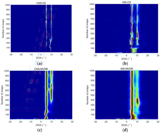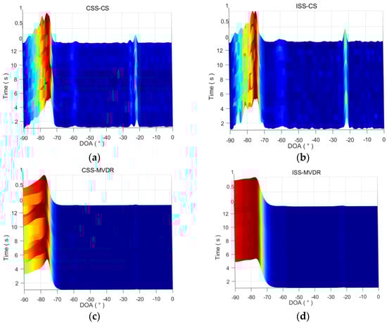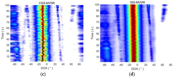 The three-dimensional DOA time tracks estimated by CSS-CS, ISS-CS, CSS-MVDR and ISS-MVDR are drawn in Figure 9. From Figure 9a, CSS-CS can estimate the DOA time tracks of the three targets, and the DOA time tracks of the −22° target is clearer than that of the −25° and −60° targets. From Figure 9b, ISS-CS can estimate the DOA time tracks of the −22° and −60° targets, but the DOA time tracks of the −25° target is unclear. From Figure 9c,d, the DOA time tracks of the three targets is blurred, and CSS-MVDR and ISS-MVDR cannot detect the three targets clearly. It also shows that, whether using ISS or CSS, the target detection capability of CS is better than MVDR; namely, the ISS-CS method is better than the ISS-MVDR, and the CSS-CS method is better than the CSS-MVDR.