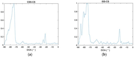 Figure 4 shows that the DOA estimation curves of CSS-CS and CSS-MVDR for two targets are very fine, indicating that the two methods have higher directional resolution than the ISS ones. It also shows that the CSS-CS and CSS-MVDR methods have a wider range of directional detection, and the DOA estimation can be achieved when the two targets are in the range of −60° to 60°. For the ISS-CS and ISS-MVDR methods, the DOA estimation of the two targets can only be carried out in the range of −50° to 50°.