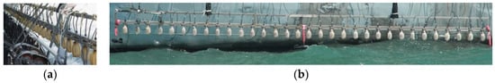 The ULA used in the marine trial. (a) Partial enlargement of the ULA; (b) The photograph of the ULA before it was put into water.