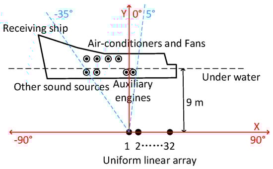 We suppose that  is the time-domain signal received by the element m of the ULA. By using the Fourier transform,  can be converted into multiple frequency-domain sub-band array signals   , where J is the number of sub-bands,  denotes the center frequency of the j sub-band, and  denotes the j sub-band signal of the element m, where M is the number of element hydrophones of the ULA.  is the matrix form of the j sub-band signals and the ULA received data model can be expressed as: