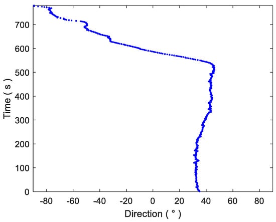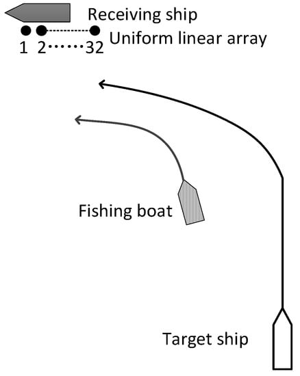 The target ship was the same type as the receiving ship, with 1.5 m draft, speed 16 knots. The target ship approached the receiving ship from about 7.4 km away, and then passed close by the receiving vessel. The direction of the target ship as determined by GPS is shown in Figure 13. At the same time, as the target ship moved, there were also fishing boats and other targets within visual range. The schematic diagram of the maritime situation during the marine trial is shown in Figure 14. In the first few seconds before the trial, the target ship was in the low-speed steering phase, and there was a fishing boat about 3 km away from the receiving ship. Therefore, in the first few seconds of the trial, the target ship signal was weaker than the fishing boat signal and in almost the same direction.