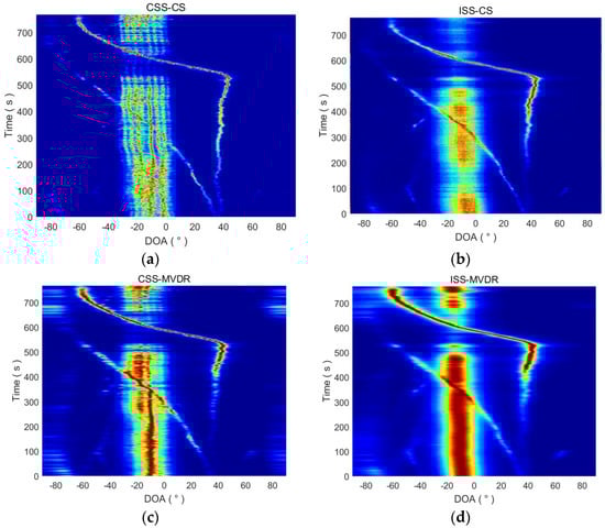 Spatial beam spectra after processing the first second data by four methods. (a) Spatial beam spectra after processing the first second data by CSS-CS; (b) Spatial beam spectra after processing the first second data by ISS-CS; (c) Spatial beam spectra after processing the first second data by CSS-MVDR; (d) Spatial beam spectra after processing the first second data by ISS-MVDR.