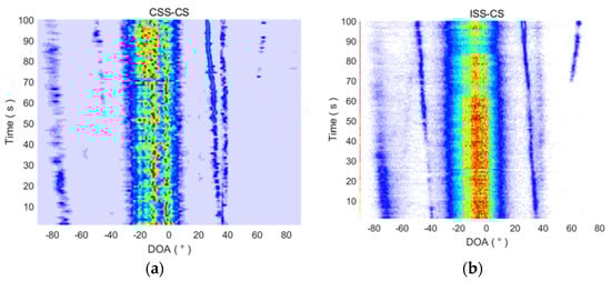 The sampling frequency of the system is 48 kHz. According to the simulation results from Section 4. A, which suggest a focused frequency of , since the hydrophone spacing is 0.225 m, the focused frequency for CSS-CS and CSS-MVDR is set at 3333 Hz in subsequent data processing. In addition, the directional scan range is (−90°, 90°) with a 0.0625° step, the analysis frequency range of broadband signal is set from 500 Hz to 3333 Hz, the sub-band bandwidth is 40 Hz, and the sub-band interval is 10 Hz. The final DOA estimation results of the four methods are shown in Figure 15. It shows that the overall target movement trend, which is also called the DOA time track, can be effectively estimated by the four methods. We found that the noise radiated from the receiving ship is mainly distributed within the range of −35° to 5°, which is consistent with the situation described in Figure 12. Figure 15 also shows that there are multiple target DOA time trackes, which look like stripes appearing in the azimuth area of the receiving ship in the course estimated by the CSS-CS and CSS-MVDR methods. That occurs because the radiated noise of the receiving ship is not a single sound source, but is composed of multiple noise signals produced by the auxiliary generators, air conditioners, fans and other instruments that were working continuously. These devices were relatively close to the receiving array, and for the high resolution method, the radiated noise of the receiving ship cannot be seen as a point source. The CSS-CS and CSS-MVDR methods have high azimuth resolution and can achieve DOA estimation of the different noise sources in the receiving ship, so there are multiple target DOA time tracks, which look like stripes, appearing in the CSS-CS and CSS-MVDR results. However, the target azimuth resolution of the ISS-CS and ISS-MVDR methods is lower, so that the DOA estimation of different radiating noise sources on the receiving ship cannot be completed, and thus there are no stripes in the ISS-CS and ISS-MVDR results. This also verifies that the CSS-CS method has a higher azimuth resolution than the other three methods.