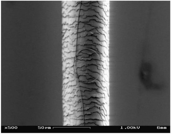 To date, a variety of materials (e.g., silicate, phosphate, tellurite, fluoride, bismuth oxide and chalcogenide glasses, and a number of polymers) have been drawn into optical-quality MNFs. To bestow the as-fabricated MNFs with more functionalities, a number of post-fabrication techniques including micromanipulation [8,39], plastic bend [39], surface coating [40,41], embedding [42,43,44,45], index modulation [12], and fusion splicing [46,47,48,49,50,51] of MNFs have been reported. Moreover, a variety of novel structures, such as MNFs with active dopants [52], panda core to maintain polarization [53], elliptical cross-sections for high birefringence [34], or suspended cores to isolate surface contamination and contact leakage [54,55,56] have been also reported. For reference, Figure 5 shows electron microscope images of typical glass and polymer MNFs, in which the geometric uniformity and mechanical flexibility of MNFs are clearly seen.