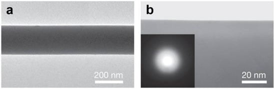 TEM images of (a) a 240-nm-diameter silica MNF and (b) the surface of a 330-nm-diameter silica MNF. The electron diffraction pattern (inset) demonstrates that the MNF is amorphous. Reprinted with permission from [22]. Copyright 2003 Springer Nature.