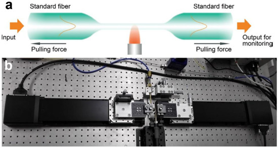 A typical illustration of high-temperature taper-drawing process is shown in Figure 3a. A hydrogen flame is used to heat the fibre to its softening temperature. Under a certain pulling force, the fibre is stretched and elongated gradually with reduced diameter until the desired length or diameter is reached. Using this technique, the as-fabricated MNF is usually attached to the standard fibre through the tapering area at both ends, and is usually mentioned as a “biconical” fibre taper or MNF. Meanwhile, by measuring its optical transmission, it is possible to in-situ monitoring the waveguiding properties of the MNF during the pulling process in terms of propagation loss, multi-mode interference and group velocity delay [9,26,27]. Also, the amorphous structure and the surface tension of the molten glass bestows the MNF with perfect circular cross-section, which is ideal for obtaining waveguiding modes by analytically solving Maxwell’s Equations in a cylindrical coordinate [28].