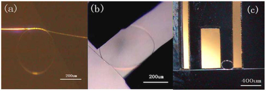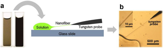 For polymer MNFs, a number of fabrication techniques have been successfully developed [24], among which physical drawing is the best approach to optical-quality MNFs with excellent geometric uniformity and surface smoothness. In a typical physical drawing fabrication, as shown in Figure 4, a sharp tip (e.g., a tungsten probe or a tapered fibre probe) is used to directly draw polymer MNFs out of a droplet of polymer solution at room temperature. By controlling the drawing speed (typically millimeters to meters per second, depending on the material and temperature) and the solution concentration, the diameter of the MNF can be roughly determined [36,37].