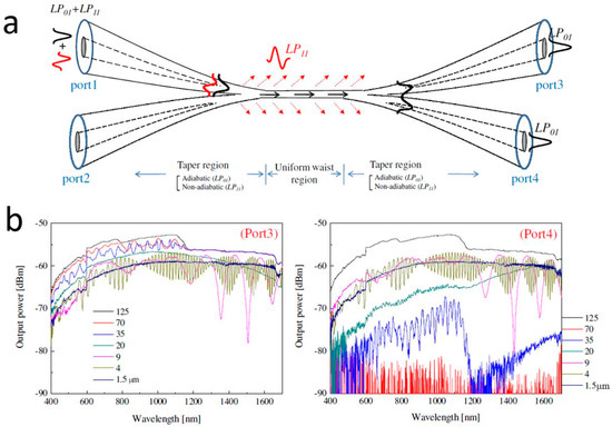 Single-mode biconical MNF coupler at telecommunication band. (a) Schematic diagram; (b) Spectral outputs of the MNF directional coupler. Reprinted with permission from [76]. Copyright 2009 OSA.