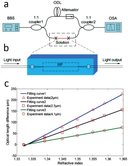MNF-based MZI RI sensor. (a) Schematic configuration; (b) Schematic diagram of the sensing arm. BBS, broadband light source; ODL, optical delay line; OSA, optical spectrum analyzer; MF, microfibre; (c) Optical length variation with the RI at different MNF diameters. Reprinted with permission from [84]. Copyright 2012 OSA.