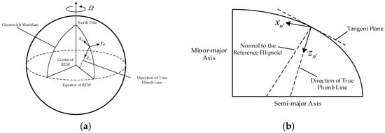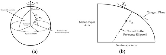 where is a DCM which can transform vectors from to , and this DCM can be calculated based on the geometrical relationship between the two navigation coordinate frames. As shown in Figure 6, is aligned with the normal gravity vector and is aligned with the true gravity vector, and the geometrical relation between the two navigation coordinate frames is determined by DOV. frame can be obtained through rotating the coordinate frame by along the rotational axis .
