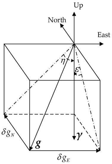 Compensation in velocity calculation is to convert the normal gravity vector to obtain the true gravity vector in the coordinate frame with DOV information. The true gravity vector in the coordinate has a concise form as Equation (16), the true gravity vector in frame can be obtained as follows: