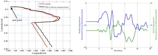 Inertial navigation systems (INSs) which measure the ship’s motion and constantly update the ship’s position are currently the main means of ship navigation. The performance of INS depends not only on the quality of inertial sensors, but also on the accuracy of the gravity information [1,2,3]. Even in the limiting situation of drift-free gyroscopes and perfect accelerometers, INS cannot be error-free, because uncertainties in the gravity model will produce errors. In recent years, significant improvements of INS, especially on the inertial sensors, have left horizontal gravity disturbances as the most important error sources of the navigation solution, particularly for rough topological areas [4,5]. In future highly accurate and long-endurance ship-mounted INS, cold atom interferometry gyroscopes will be used, with which the inertial-sensors-induced position error would be reduced to only a few meters per hour [5], so the compensation of horizontal gravity disturbances has to be considered.