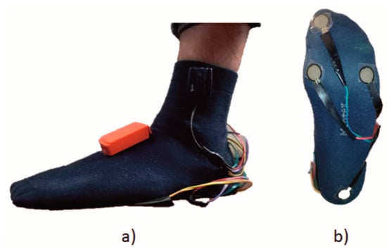 Sensors positioning on subject. (a) Position of IMU on participant’s foot; (b) position of footswitches under participant’s foot.