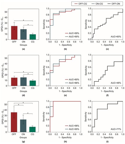 (a,d,g) Mean and Standard Error of GPQI of patients in both condition (OFF, ON) and control group (CG); (b,e,h) ROC analysis of GPQI for OFF vs CG and ON vs CG; (c,f,i) ROC analysis of GPQI for OFF vs ON. Each chart type is reported for three subgroups, G0–3, G0–1 and G2–3, respectively.