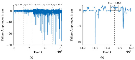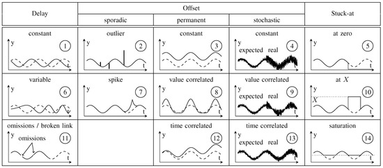 In general, a series of failure amplitudes represents a sensor’s behavior in case of a failure and thereby is an instantiation of its failure characteristics. As this behavior can be time- or value-correlated [4,19,32], the function value of depends on the sensor’s operation time k as well as on the magnitude of the observed phenomenon .