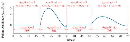 To illustrate these concepts, we consider once again the example of the Spike failure type, extending it in Figure 6 to show the time intervals during which the failure type is active and inactive. In the example, the first occurrence of the failure type lasts for 17 time units, corresponding to , while the second occurrence lasts for 24 time units (). These time intervals represent two instances of the TtR. The time intervals during which the failure type is not active constitute instances of the TBF, in this case with lengths of 18 time units () and 16 time units ().