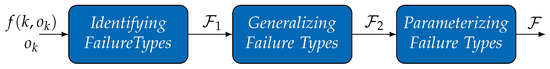 The purpose of is to represent the contribution that a failure type has on a sensor’s failure characteristics. As mentioned before, a failure type is intended to represent only a specific, deterministic aspect of the overall characteristics. On the other hand, failure characteristics are subject to randomness. To account for both properties, encompasses two parts: a deterministic, called the failure pattern [3,33,35], and a stochastic part . While the deterministic part models the specific aspect of the failure characteristics, the stochastic part represents the randomness with which the aspect may occur. Considering both parts, the function is defined as follows: