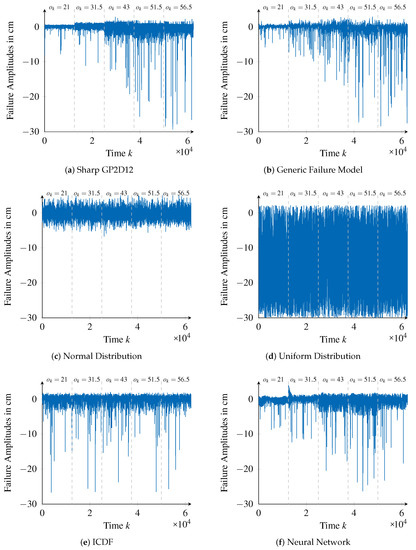 The several failure models that we constructed in the previous section are not directly comparable with each other, that is, it is not possible to know how much better or worse they represent the failure characteristics of the distance sensor just by comparing the parameters describing them. Therefore, to support a comparison, in this section we sample the previously obtained failure models using Monte Carlo simulations. The obtained series of failure amplitudes, one for each failure model, constitute expressions of what the failure model actually represents. Therefore, they allow their comparison by observing how closely the respective failure amplitudes resemble the ones originally obtained from the distance sensor. They also facilitate a comparison with the validation data (i.e., the originally obtained failure amplitudes that were not used for obtaining the failure models), which is done in Section 6.3 using the assessment measures introduced in Section 6.2.
