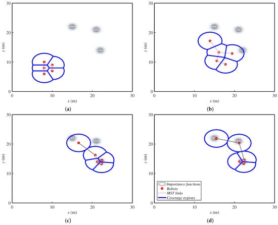 30], a high-level method is presented for managing tree topologies, which can be combined with motion tasks such as coverage, but the connections between the successive trees and the minimum spanning tree of the communication graph have not been established yet. In [