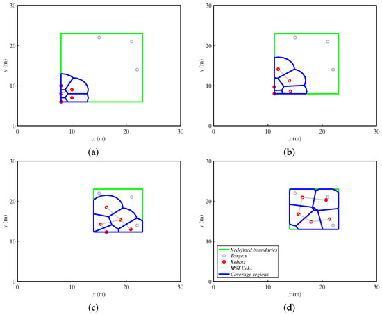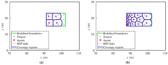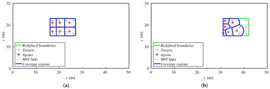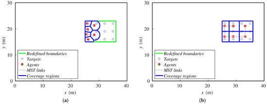Figure 8), one can conclude that, with a lower sensing radius, the agents cannot perform a wide deployment to cover the targets, and they accumulate at the rear formation.