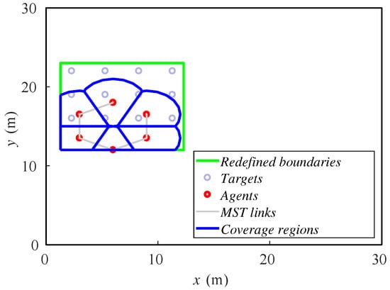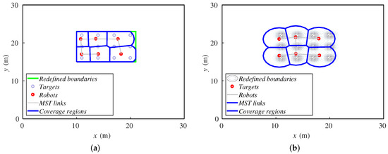 experiment”. The robots perform the role of agents, and the moving targets that should be covered are plotted with red circles. The movement of the robots reaches the green asterisks representing the centroids of each coverage region, which are drawn in blue lines. The sensing radius of the agents is set to