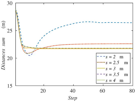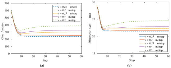 Figure 7b gathers this sum of distances along the simulation with the velocities studied. We observe the same behavior of the curves as in the cost function. In the case of higher velocities, the sum of distances increases since the agents cannot cover the whole formation. The metric minimizes also for lower velocities. For this reason, from now on, we will show this performance metric (Equation (