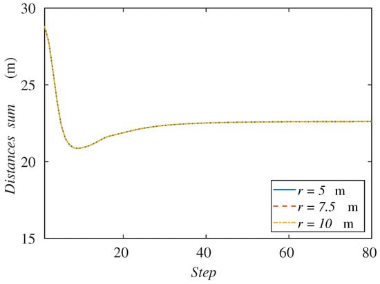 Figure 10, we can see the results of the sum of distances to the center of the formation varying the communication radius from 5–10 m. We can observe that all the graphs for each communication radius concur in the same curve. Therefore, we can conclude that this is not the reason why the agents cannot follow the formation with a lower sensing radius.