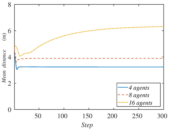 Due to the fact that the number of agents is variable, now the sum of the agents’ distances to the formation center is not an appropriate variable to represent. We graph the mean distance instead in