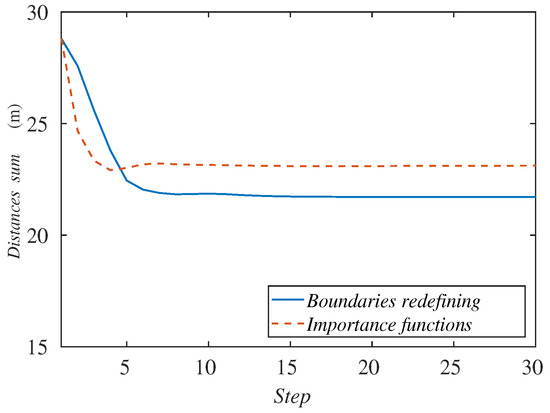 Figure 14), we can see that the value of the importance functions method quickly decreases, so its deployment is faster and its response time lower. On the other hand, the redefining boundaries method achieves a lower value, so the agents in this case are a bit better deployed.