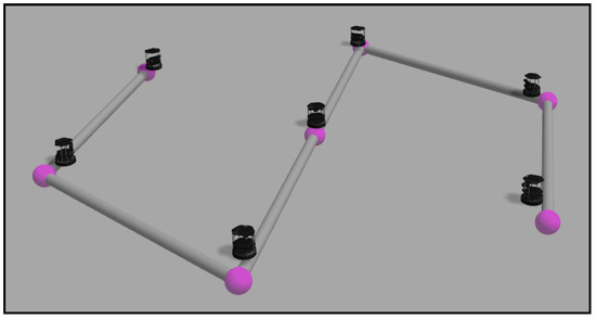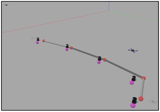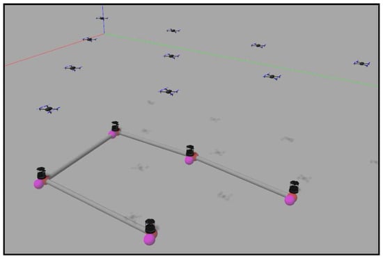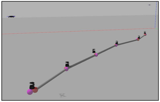 Figure 15 shows the final layout of the ground agents. We have developed a visualization system that helps to understand the movement of each agent in the Gazebo simulation. The black ground robots are the Turtlebots, which are the ones actually running the algorithms. We add some elements like the targets, implemented as aerial robots that are moved discretely. The colored spheres represent the positions of the ground robots and their goal positions in the current simulation step. Additionally, the gray cylinders represent the communication tree reached at the present step.