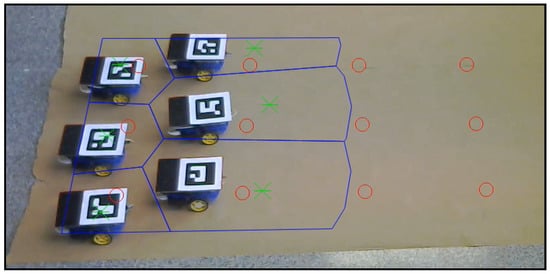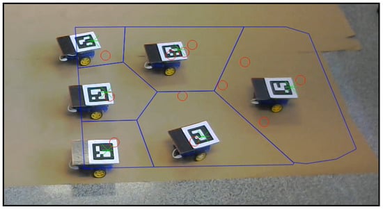 Figure 19. Six differential-drive robots act as agents, and each of them includes a Raspberry Pi 2 Model B and a driver controller. The localization of each robot is achieved using aRuCo [