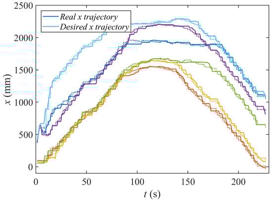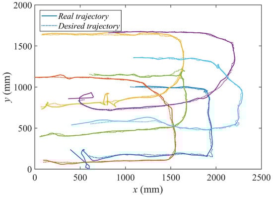 Figure 21 represents the real trajectories followed by the different agents (continuous line) against the set of consecutive goal positions (Equation (