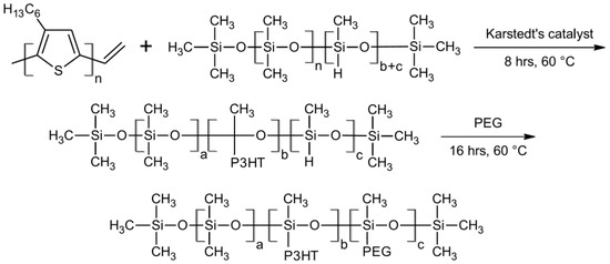 The synthesis of the vinyl terminated regioregular poly(3-hexylthiophene) (vin-rrP3HT), via the Grignard Metathesis Method (GRIM) method, and the synthesis of the vinyl terminated rrP3HT, was conducted based on the procedure described in the literature in [29] (all of the materials were from Sigma Aldrich, Saint Louis, MO, USA). The polymers of two average Mn, namely, a 10,000-chloroform fraction (CH) and a 4000-hexane fraction (H)—as determined by the gel permeation chromatography (GPC) calibrated on the polystyrene standard—were prepared. The calculated average of the P3HT repeat units were 60 and 24 for the CH and H fractions, respectively. The investigated graft polymers were obtained using the method described in the patent application [30]. The synthesis was based on the grafting of the vinyl terminated P3HT with a different chain length and PEG, or dodec-1-en onto poly(methylhydrosiloxane) (PMHS) chains (all of the materials were from Sigma Aldrich, Saint Louis, MO, USA). The scheme of the synthesis of the obtained P3HT graft copolymers is presented in Figure 1.