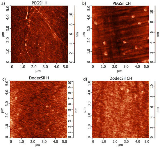 Atomic force microscopy (AFM) height images from 5 × 5 μm areas between the electrodes of (a) PEGSil H; (b) PEGSil CH; (c) DodecSil H; (d) DodecSilCH.