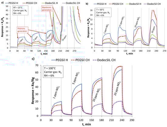 At higher temperatures (50 °C and 100 °C), a switch to the conducting state was not observed in measured the concentration range, as seen in Figure 3b,c. Thermal activation causes faster NO2 desorption/polarons recombination. Consequently the bipolarons were not generated, the sensor operated faster, and regeneration was more efficient.